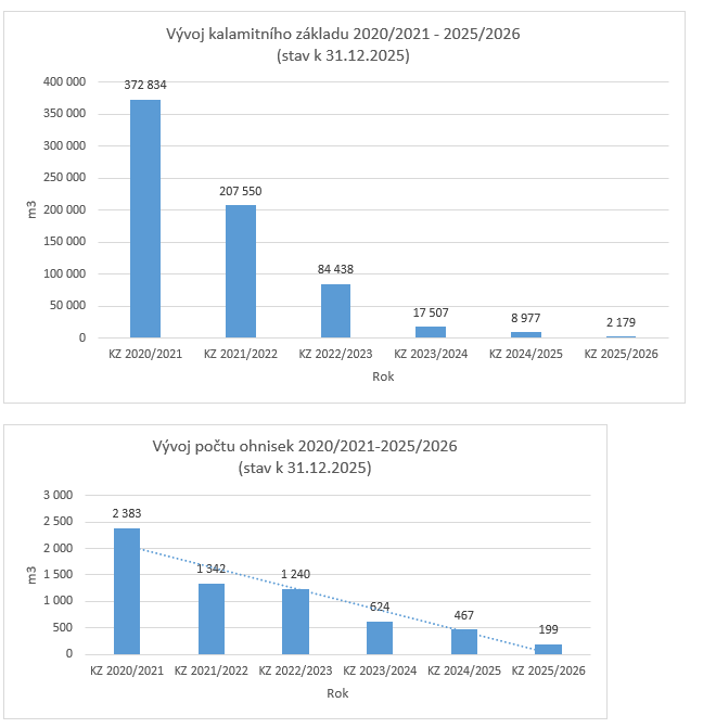 Obávaný brouk je i nadále na ústupu z lesů. Potvrzuje to pokles kalamitního základu a počtu i velikosti kůrovcových ohnisek. V aktuálním období 2025/2026 se kalamitní základ snížil o téměř 75 % (z 9 tis. m3 na 2,5 tis.m3) ve srovnání s minulým obdobím 2024/2025. Za celý rok 2025 bylo zpracováno pouze 7 100 m3 kůrovcového dříví, což je méně než polovina objemu zpracovaného v roce 2024 (18 300 m3).